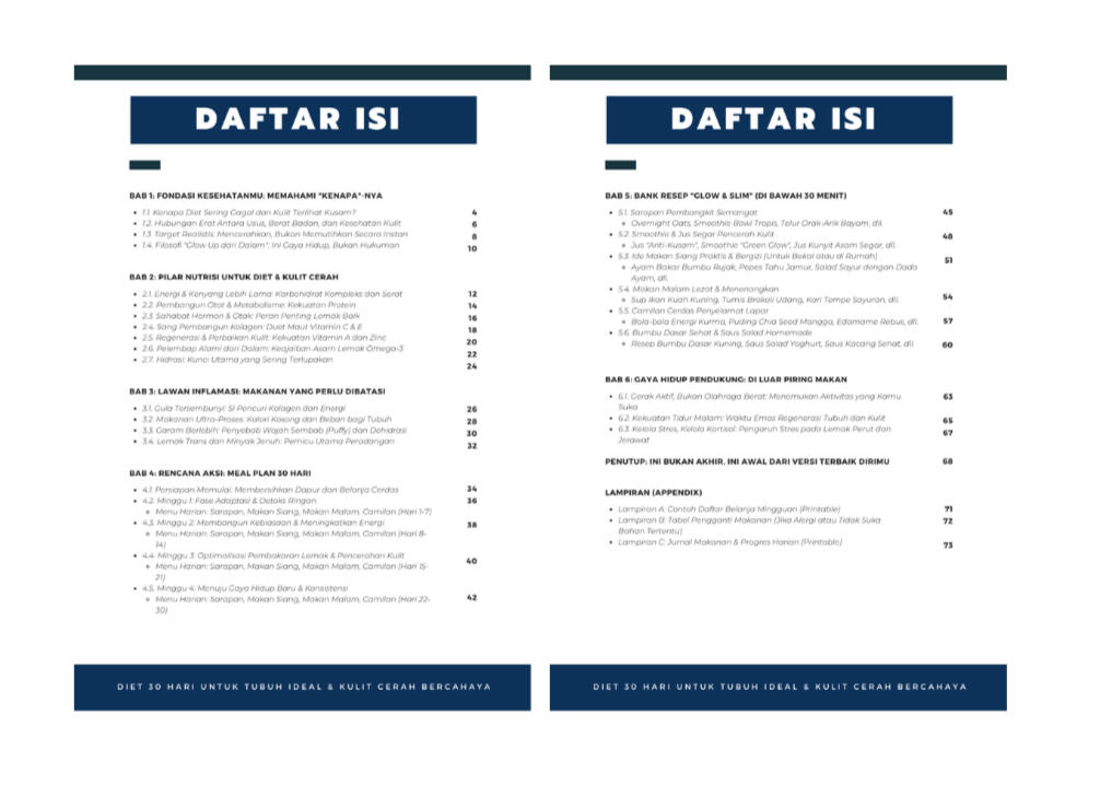 Ini bukan sekadar e-book resep. Ini adalah program transformasi 30 hari terlengkap yang akan mengubah cara Anda memandang makanan, tubuh, dan kulit Anda selamanya.